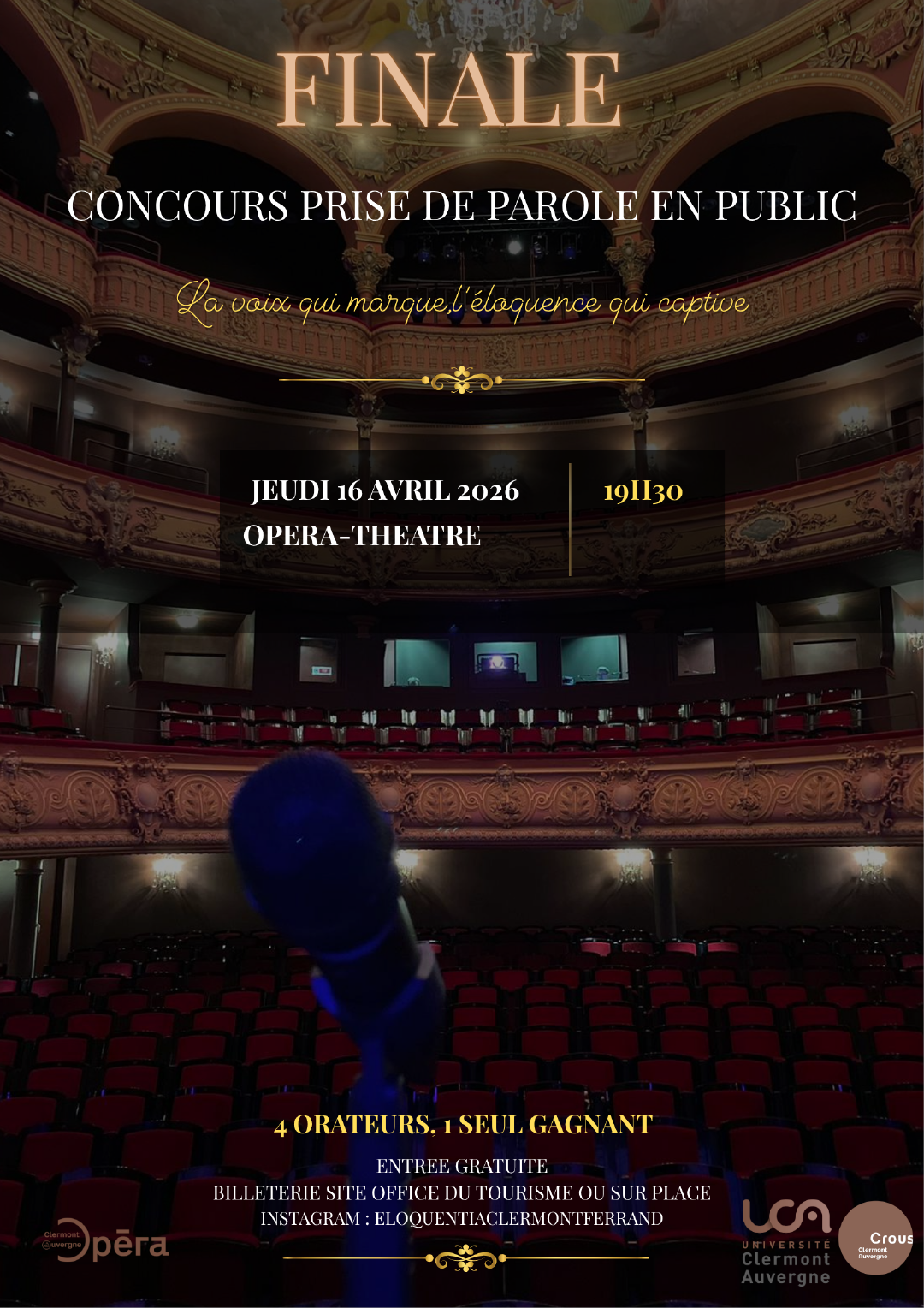 Cette évènement met en lumière 4 orateurs ayant passé toutes les phases de notre concours pour ainsi performer à l’opéra Thé?tre. L'objectif étant de mettre en avant tout l’art oratoire présent à Clermont-Ferrand !