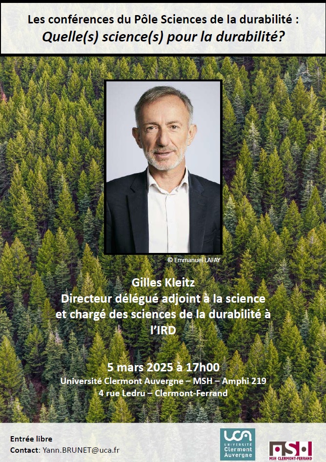 Le 5 mars dernier, Le P?le Sciences de la durabilité avait le plaisir de recevoir et d’écouter dans le cadre de sa première conférence Gilles Kleitz, directeur délégué adjoint à la science au sein de l’Institut de Recherche et Développement (IRD), à la Maison des Sciences de l’Homme. Cette intervention a constitué une très bonne entrée en matière pour qui n’était pas familier de la Science de la durabilité (SdD) tout en proposant des actions précises entreprises au sein de l’IRD pouvant bénéficier aux acteurs clermontois plus ou moins impliqués dans cette démarche également.