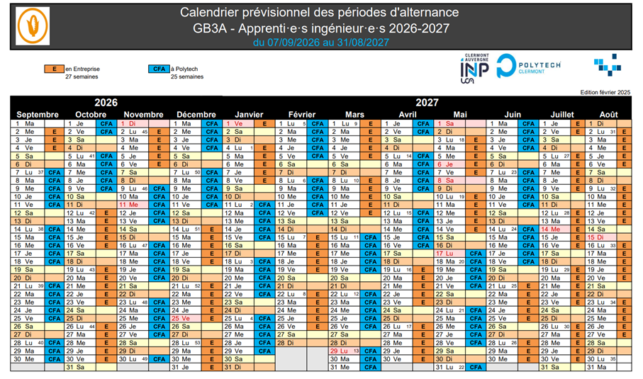 Le cursus de trois années d’étude est caractérisé par une alternance de période en entreprise (88 semaines) et à Polytech Clermont sur le site d’Aubière (64 semaines). Lien vers le planning prévisionnel 2026-2027.