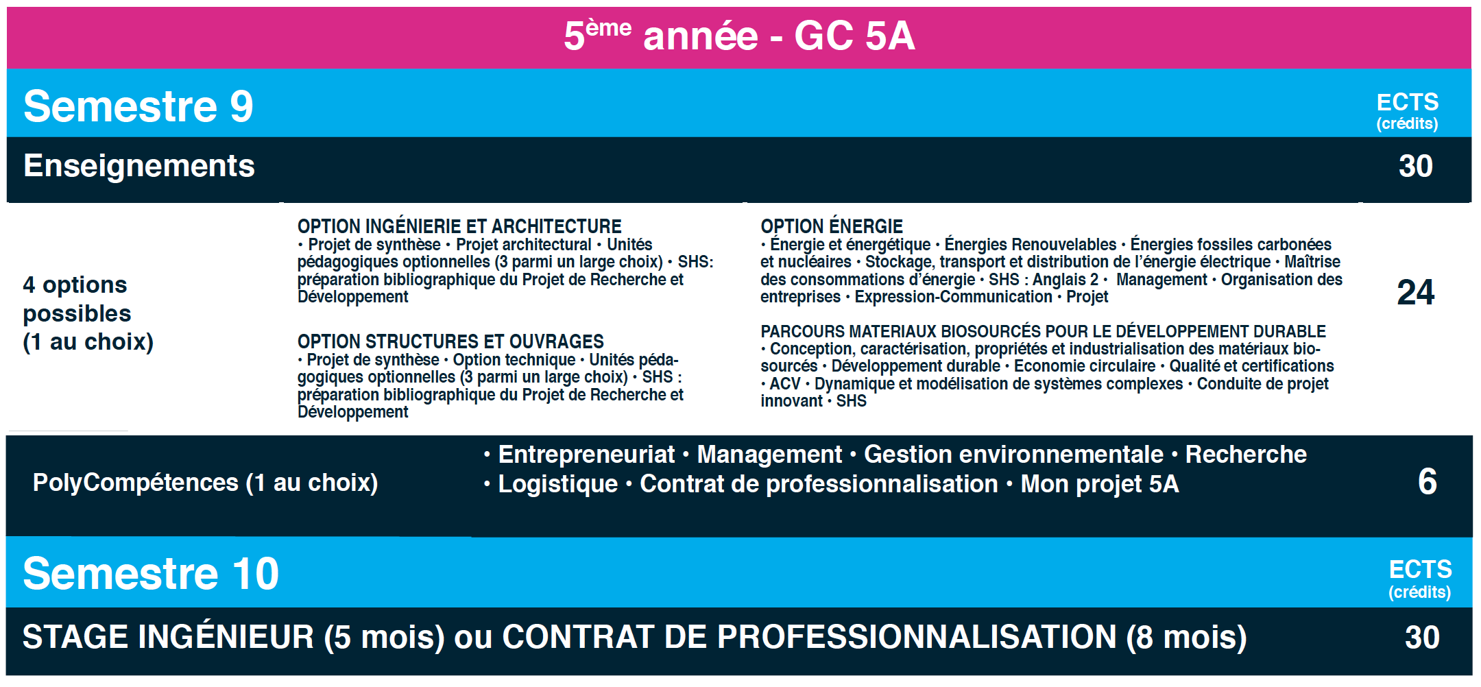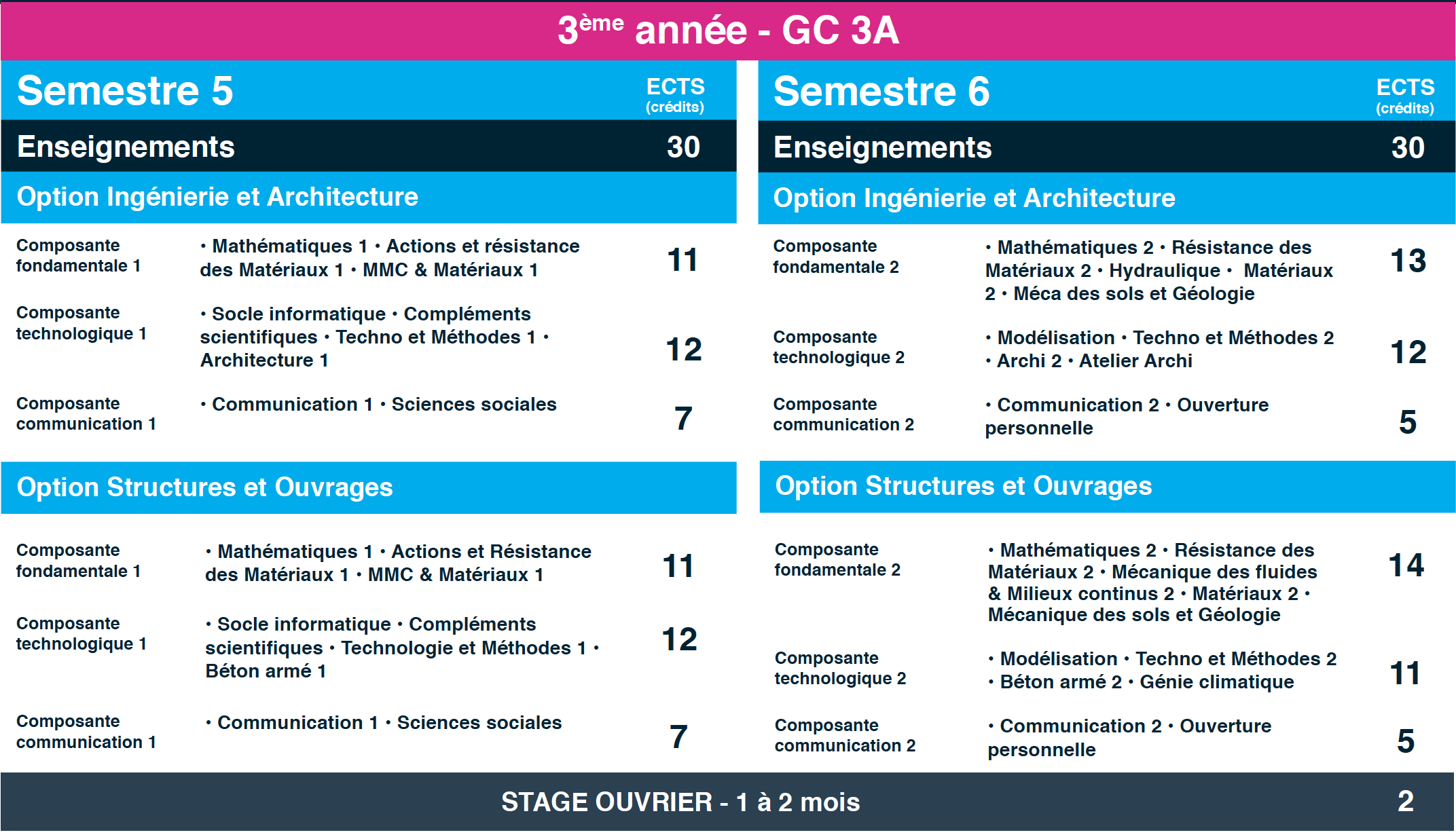 La formation d’un ingénieur en Génie Civil nécessite une approche théorique importante faisant appel aux sciences de bases comme les mathématiques, les statistiques et probabilités, la mécanique, la physique, le calcul numérique mais également une approche plus technologique comprenant des disciplines appliquées comme le béton armé, la construction métallique, la géotechnique ou l’organisation et la gestion des chantiers, les procédés généraux de construction ou encore l’architecture.