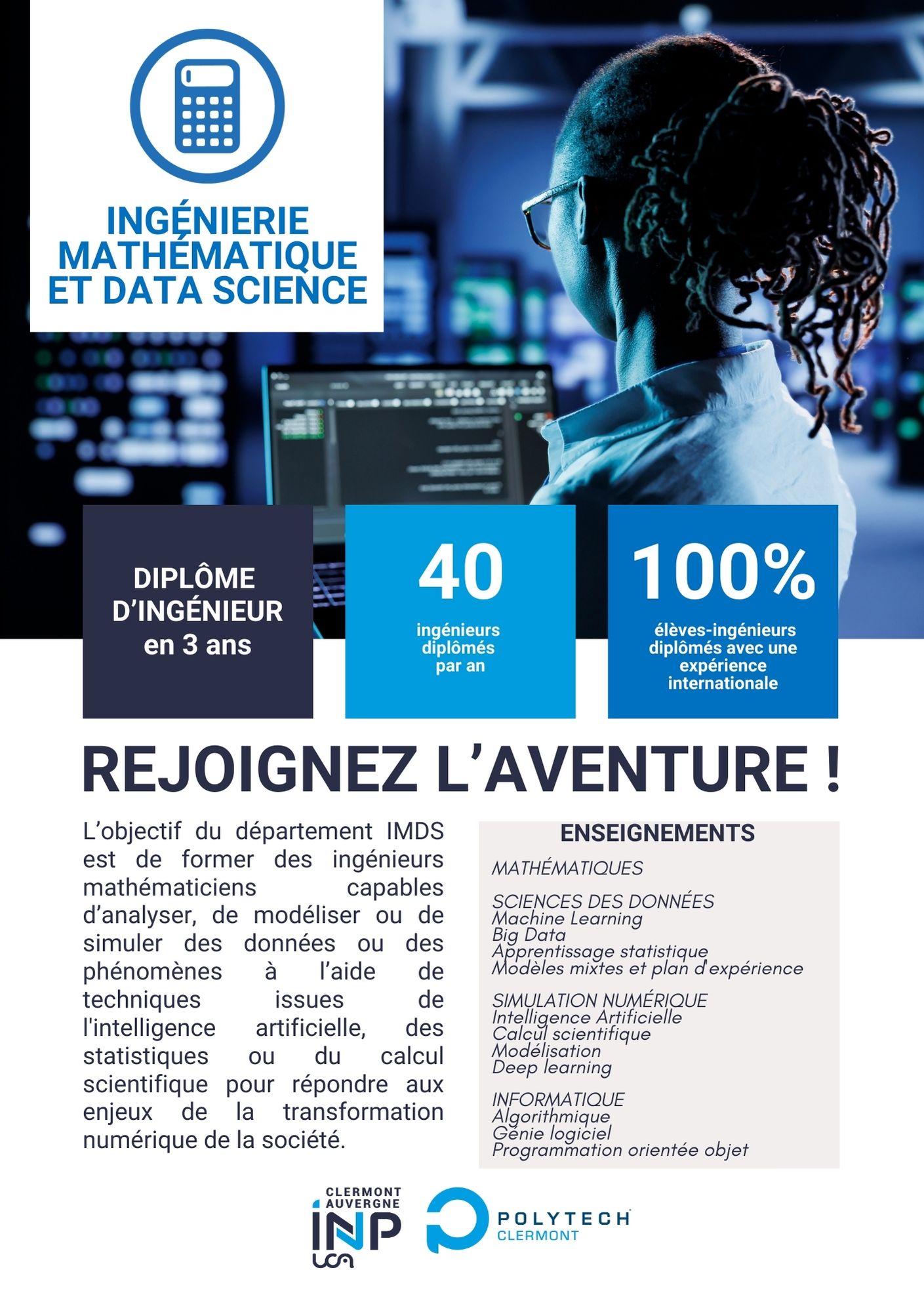 The Mathematical Engineering and Data Science (IMDS) Department trains engineers specialized in: