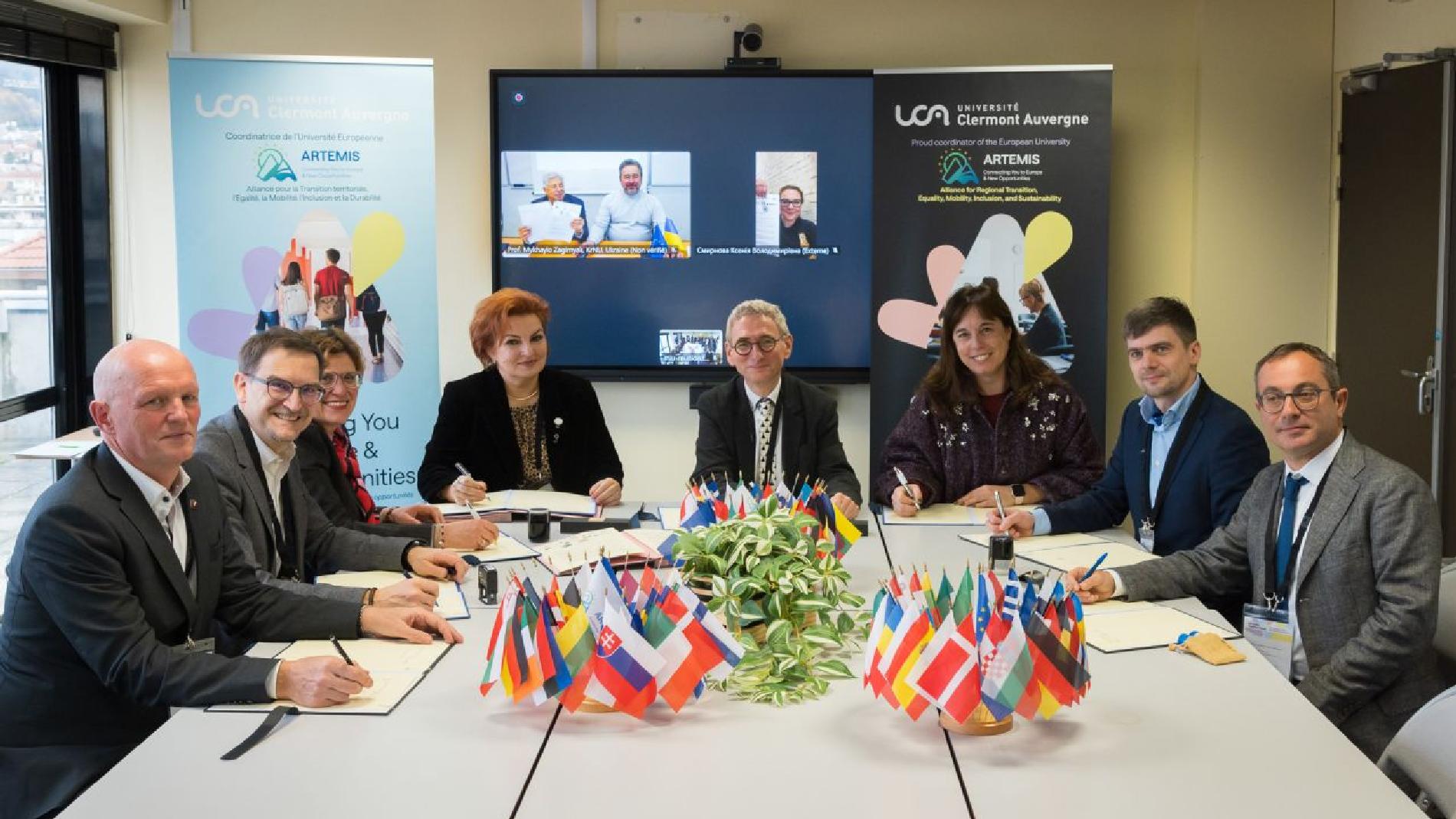 Du 3 au 5 décembre 2025, l’Université Clermont Auvergne a accueilli les délégations des universités partenaires à l’occasion de l’ARTEMIS Together Week, organisée pour réunir l’ensemble de ses instances décisionnelles (Governing Board) et consultatives (Student Board ; Gender, Diversity and inclusion Board ; Stakeholders Board). L’événement a été marqué par la signature de l’Erasmus+ Umbrella Agreement par les présidents des huit universités membres, ainsi que du Memorandum of Understanding, également ouvert aux universités partenaires ukrainiennes. L’événement a également permis de réunir partenaires et publics UCA autour du premier ARTEMIS Diversity Day consacré aux enjeux de diversité et d’inclusion.