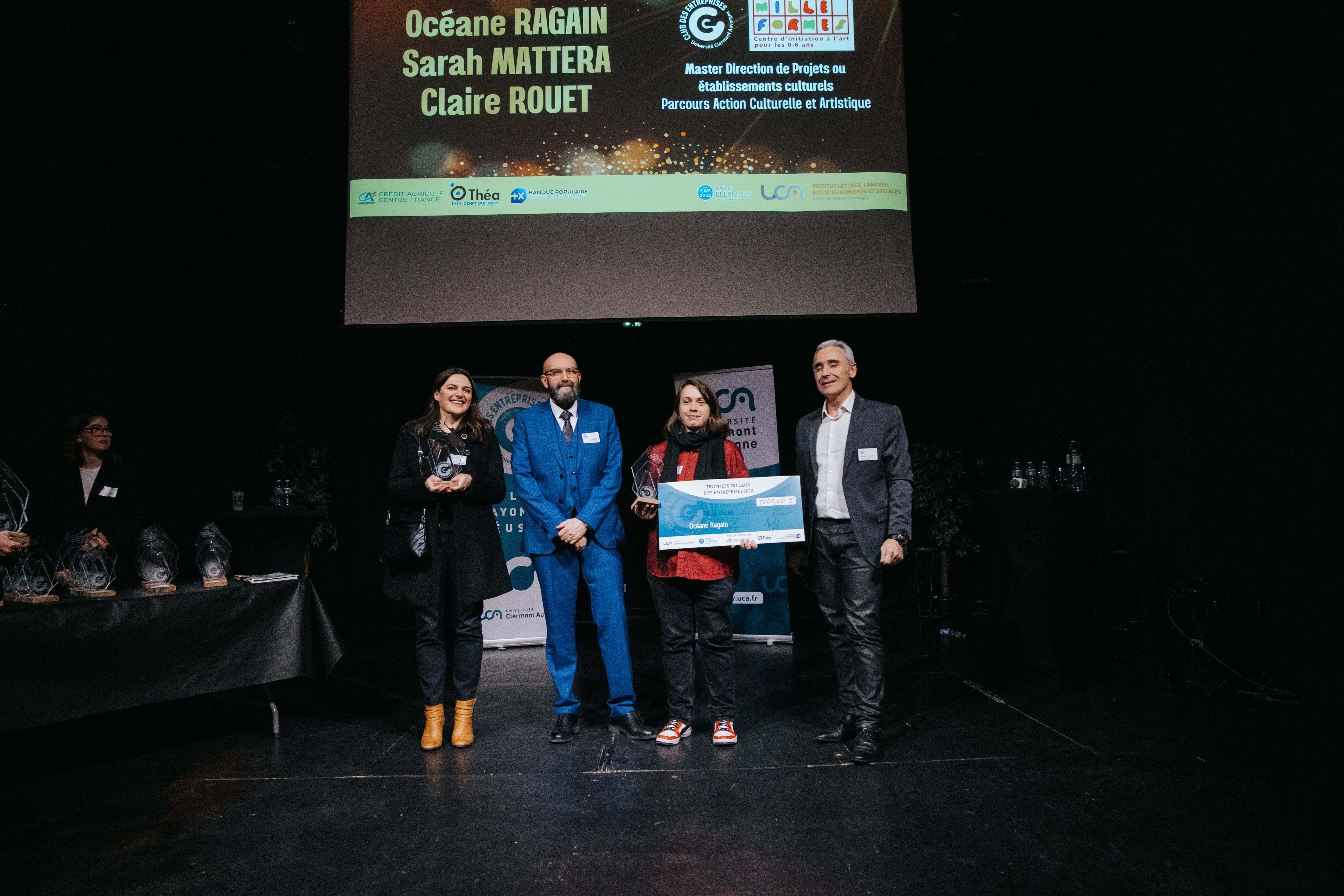 Prix remis par Emmanuel CHARRITTON du Crédit Agricole Centre France (sponsor) à l'étudiante Océane RAGAIN (étudiante en Master Direction de projets ou établissements culturels parcours Action culturelle et artistique), son enseignante Claire ROUET, et ses tutrices entreprise Sarah MATTERA et Violaine MOREAU pour le projet de stage au sein de Mille Formes, Centre d'initiation à l'art porté par la Ville de Clermont-Ferrand.