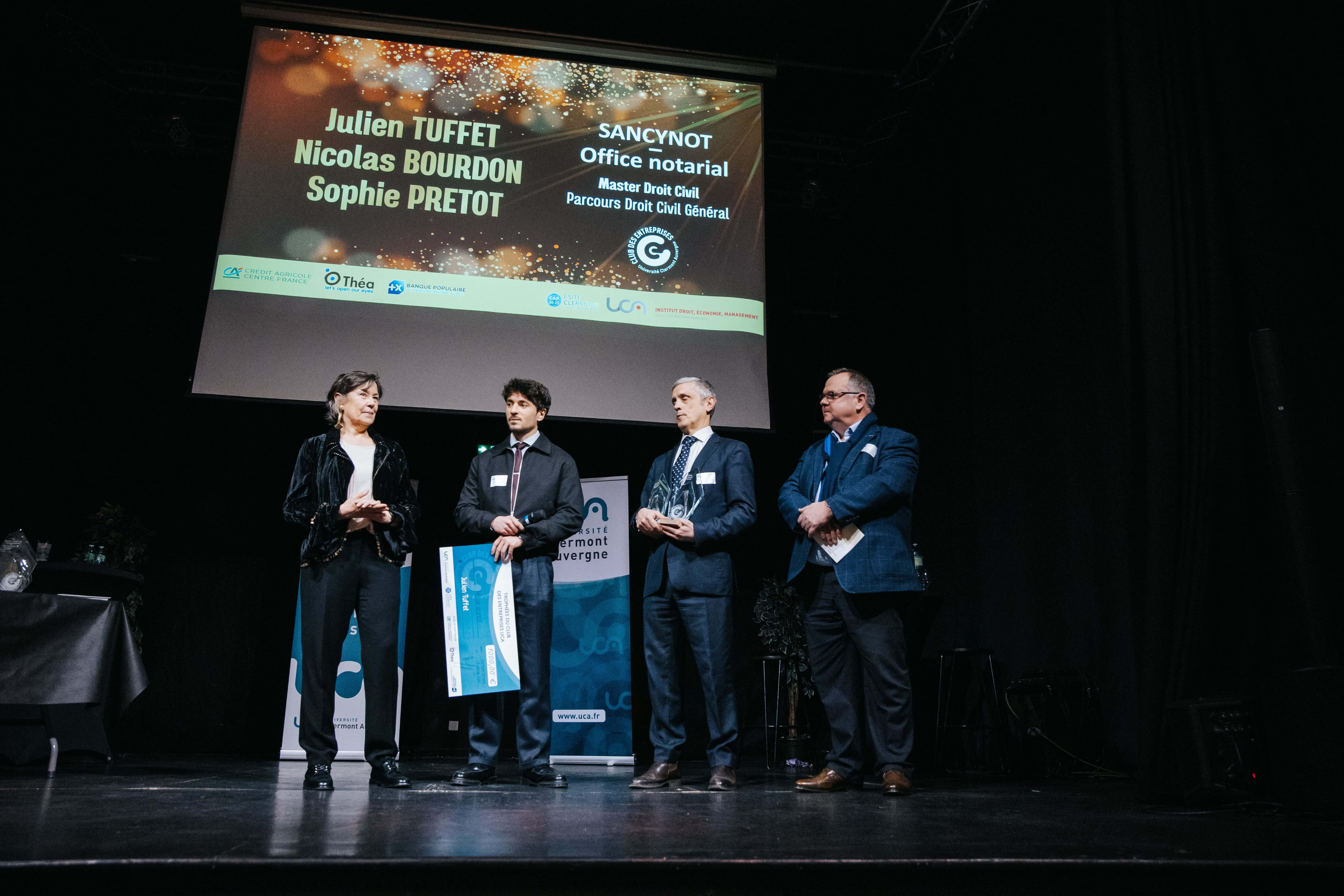Prix remis par Philippe BEY de la Banque Populaire Auvergne Rh?ne Alpes (sponsor) à Julien TUFFET (étudiant du Master 2 Droit Civil Général), ses responsables de formation Sophie PRETOT et Jean Fran?ois RIFFARD, et son tuteur entreprise Nicolas BOURDON pour un stage de fin d'études réalisé au sein de l'office notarial SANCYNOT.