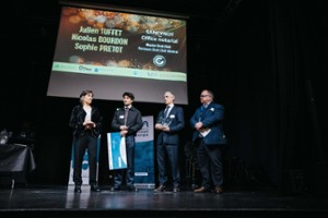 Prix remis par Farida TOMASELLA d'Environnement Recycling à Typhène ROCHOUX (?tudiante en Master 2 Sciences du médicament et des produits de santé), son enseignante Laurence TERRAIL, et sa tutrice entreprise Chantal SAVANOVITCH pour un stage au sein du Laboratoire ACCePPT.