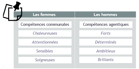 Tout comme nous associant les attributs de la baguette, du béret, de la bouteille de vin rouge, au fran?ais typique, nous associant des caractéristiques précises aux femmes et aux hommes (Figure 1). Dans le domaine de l’enseignement supérieur, ainsi que dans les entreprises notons qu’il persiste un effet : celui du ? Think Manager Think Male ? (Schein, 1973 ) : ainsi, dans la perception générale le manager c’est la personne qui possèdent des caractéristiques masculines (ie. Agentiques). L’ensemble de ces stéréotypes sont omniprésents dans notre quotidien et sont continuellement véhiculés depuis notre enfance (au travers des attentes de nos enseignant·e·s, de nos camarades, de nos parents, au travers des médias…). Or, à force d’y être confronté·e·s nous en sommes influencé·e·s et nous internalisons certains d’entre eux (ex. une femme peut appréhender de faire un créneau devant une assemblée d’hommes, et, un homme peut appréhender de préparer un repas devant une assemblée de femmes).
