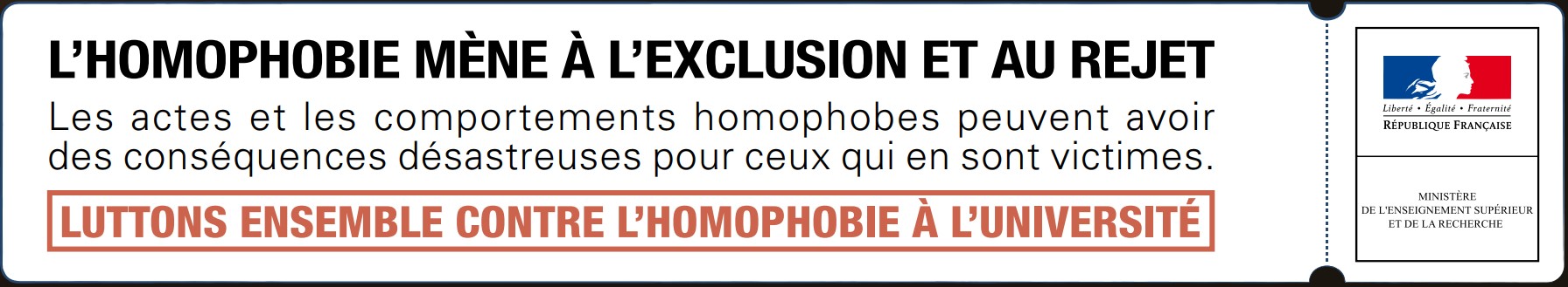 "Lutter contre l'homophobie : le combat de toutes et de tous" vise à sensibiliser les étudiants et l'ensemble des personnels des établissements d'enseignement supérieur aux difficultés rencontrées par certains étudiants encore trop souvent victimes de discrimination en raison de leur orientation sexuelle ainsi qu'aux conséquences parfois dramatiques d'actes et de comportements homophobes.