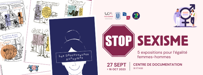 Pour accompagner la campagne de sensibilisation aux violences sexistes et sexuelles de l'UCA, le centre de documentation accueille une nouvelle expo, STOP Sexisme. Elle sera constituée de 4 séries d'affiches autour de l'égalité femmes-hommes et d'une série de portraits de femmes brillantes ayant fait avancer la science.