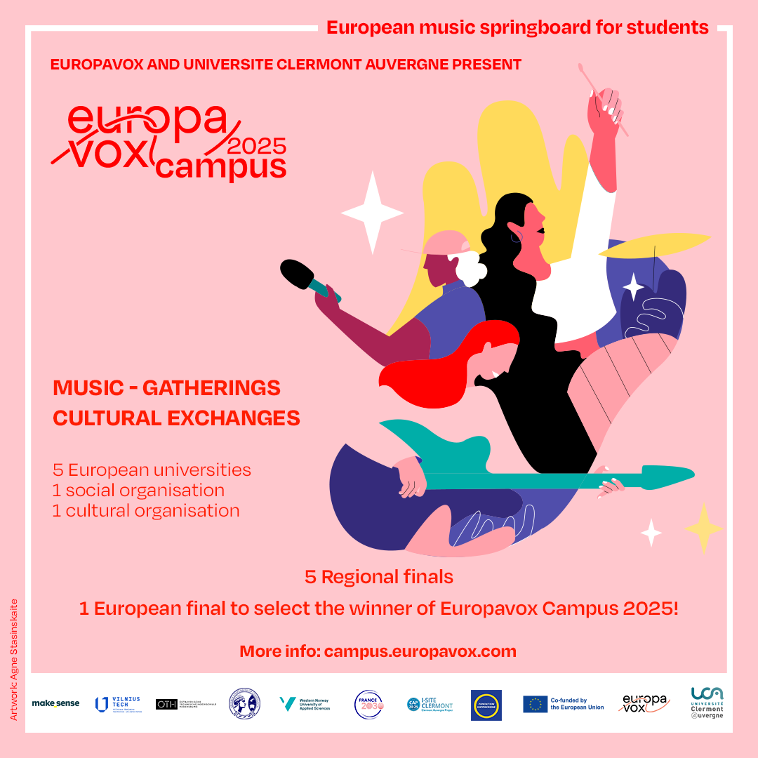 Cette année, l'Université Technique Gediminas de Vilnius (Vilnius, Lituanie) rejoint le consortium, marquant un nouveau chapitre pour le projet aux c?tés de l’Université Clermont Auvergne (Clermont-Ferrand, France), HVL (Bergen, Norvège), Universitatea Ovidius (Constan?a, Roumanie) et OTH (Ratisbonne, Allemagne). En collaboration avec les organisations sociales et culturelles makesense et Europavox, le consortium s’apprête à redéfinir la créativité, la musique et la collaboration entre les jeunes, à travers le premier tremplin musical européen pour les étudiantes et étudiants.