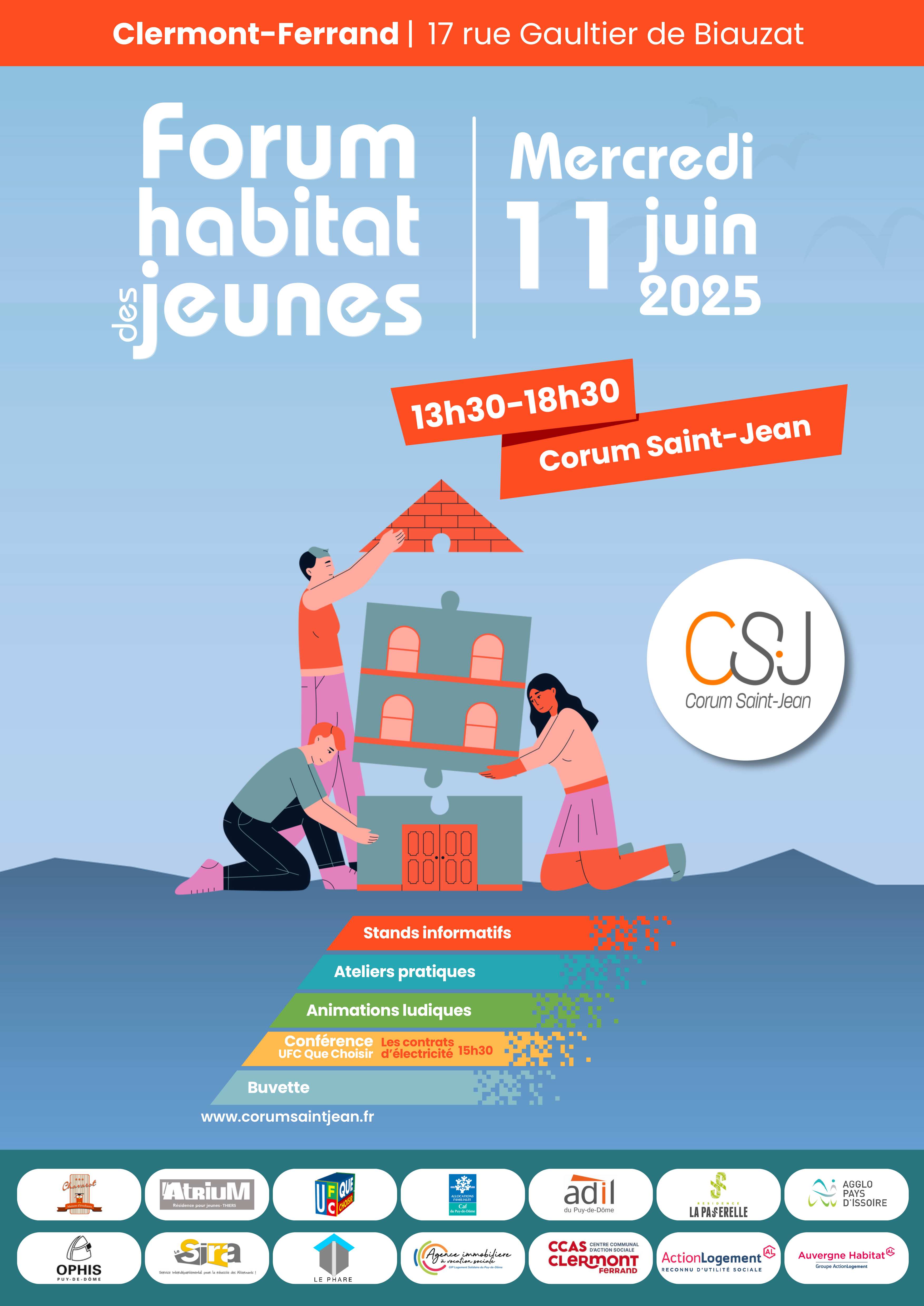Le Corum Saint-Jean organise le Forum Habitat des Jeunes : mercredi 11 juin 2025 ,de 13h30 à 18h30, 17 rue Gaultier de Biauzat à Clermont-Ferrand.